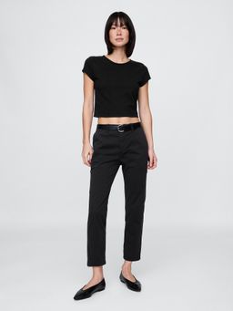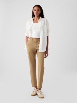 - A középmagas derékrész és a testhez simuló szabás a csípőnél és combnál elegáns sziluettet formál, miközben enyhe bőséget hagy a combok körül.